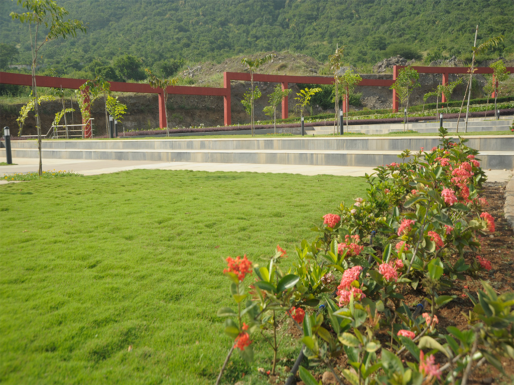 For a client like IBP, the landscape design posed some challenges. The client hoped for a design that would complement its modern architecture. The design also had to incorporate the natural slope present at the onsite. In a subtle departure from the traditional landscape, this design is not to be explored at the usual eye level, but to be experienced as one ascends the steps. Steps flank the natural slope with the plantation. The red frames set the strong lines reflecting the corporate utility of the structure. The circular landscaped terrace that envelops the building is a prerequisite orientation before the actual entrance. This landscape is a flawless extension of the interior of the building. The wide flat area close to the structure is the perfect spillover space for the indoor activities. Seatings under trees and plazas are placed at an easy access from the two developed phases. The landscaped podium adds to an aesthetic sight from the building’s windows giving it a much-needed breather in terms of bringing the nature into the structure visually.