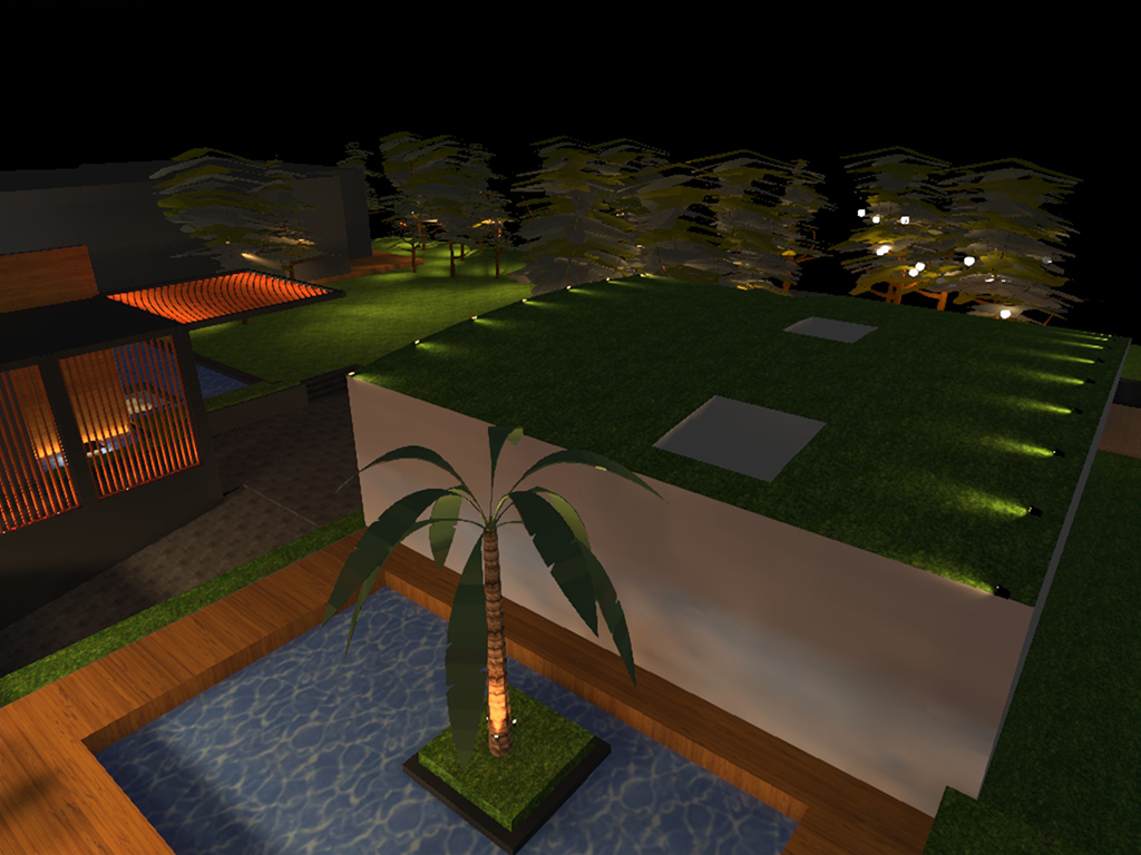 The client envisioned a landscape illumination that would compliment the rustic theme of the project as well as the inclined green roof Clubhouse/Office which was the unique feature. Keeping this in mind, we have designed the illumination for the sports area swimming pool, individual private garden area water body compound lighting. The pathway is highlighted by inground directional spots and the cascading water is highlighted by linear wall washer and up lighting tree foliage creates a majestic entrance experiences. The multipurpose court is given proper flood lighting as per sports standards. The lawn and the private garden are lit by moon lighting technique on existing trees. The inclined clubhouse green roof pitch is highlighted using LED spots. The official lounge area is uniformly lit by hanging lanterns on existing trees. The water body is lit using fibre optic and under water light.