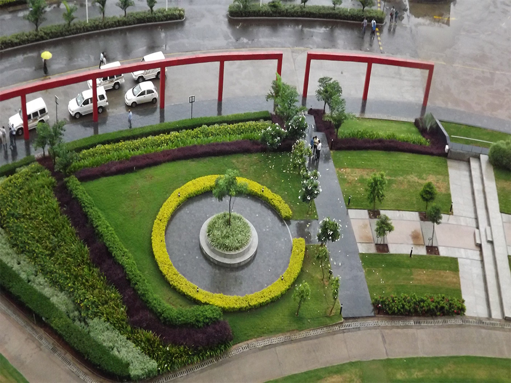 For a client like IBP, the landscape design posed some challenges. The client hoped for a design that would complement its modern architecture. The design also had to incorporate the natural slope present at the onsite. In a subtle departure from the traditional landscape, this design is not to be explored at the usual eye level, but to be experienced as one ascends the steps. Steps flank the natural slope with the plantation. The red frames set the strong lines reflecting the corporate utility of the structure. The circular landscaped terrace that envelops the building is a prerequisite orientation before the actual entrance. This landscape is a flawless extension of the interior of the building. The wide flat area close to the structure is the perfect spillover space for the indoor activities. Seatings under trees and plazas are placed at an easy access from the two developed phases. The landscaped podium adds to an aesthetic sight from the building’s windows giving it a much-needed breather in terms of bringing the nature into the structure visually.