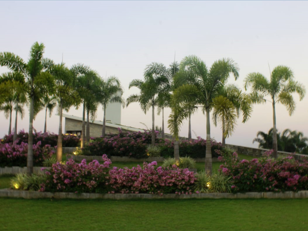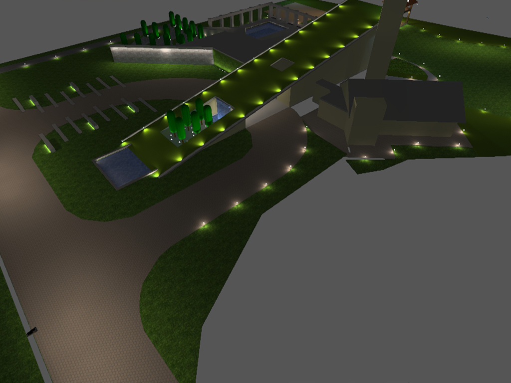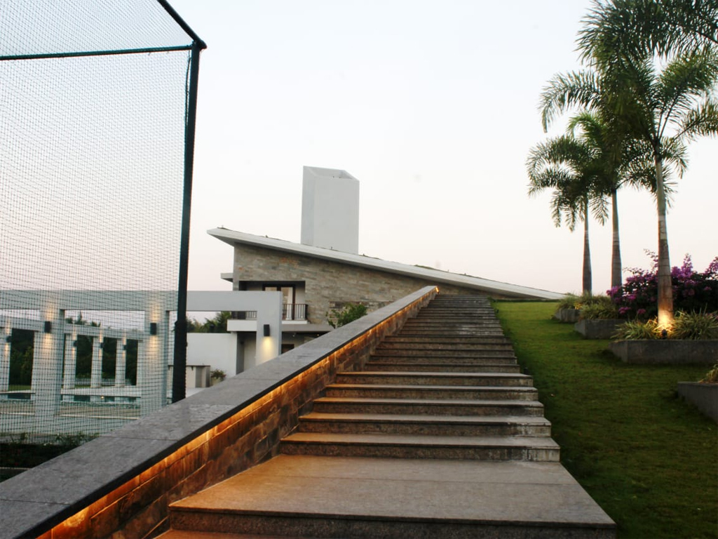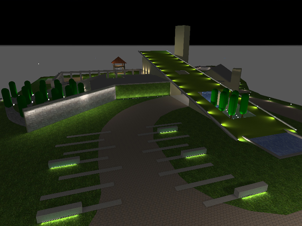 The client wished for a design that would highlight the expanse of project and its multiple utility area and the inclined green roof. The first slope is high lighted using led spots and the green roof with puncture is highlighted by picking the palms giving it a grand entrance. The second slope is highlighted by picking the supari palm trees with led uplighters.The pitch of this roof is lit by a led strip which runs along the handrail in a way that it enhances the view of this green slope. LED lighting is effectively utilised along the 6m driveway ,which has the seat walls, to give it a floating effect. The multi purpose court is given proper flood lighting as per sports standards. The lawn, entrance road and kids play area is sufficiently lit to have a uniform lux level. The pathway is highlighted by low level bollards and the green wall is highlighted by linear wall washer.