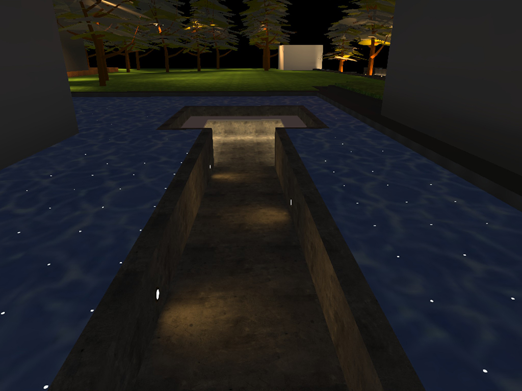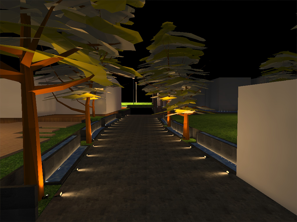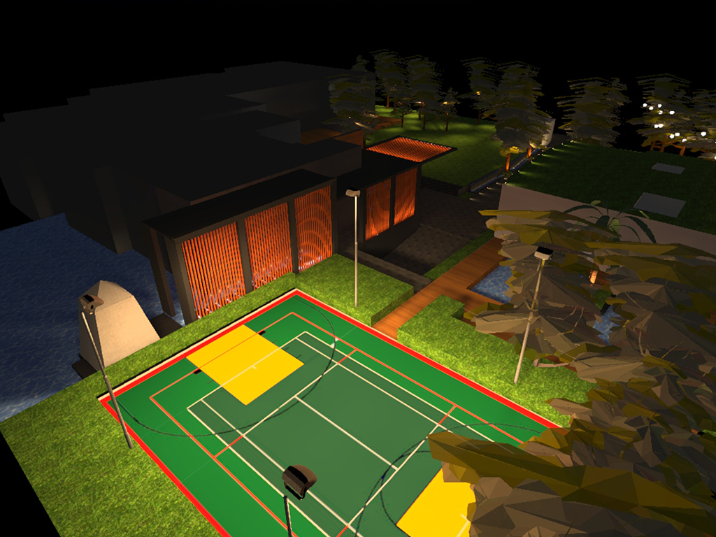 The client envisioned a landscape illumination that would compliment the rustic theme of the project as well as the inclined green roof Clubhouse/Office which was the unique feature. Keeping this in mind, we have designed the illumination for the sports area swimming pool, individual private garden area water body compound lighting. The pathway is highlighted by inground directional spots and the cascading water is highlighted by linear wall washer and up lighting tree foliage creates a majestic entrance experiences. The multipurpose court is given proper flood lighting as per sports standards. The lawn and the private garden are lit by moon lighting technique on existing trees. The inclined clubhouse green roof pitch is highlighted using LED spots. The official lounge area is uniformly lit by hanging lanterns on existing trees. The water body is lit using fibre optic and under water light.